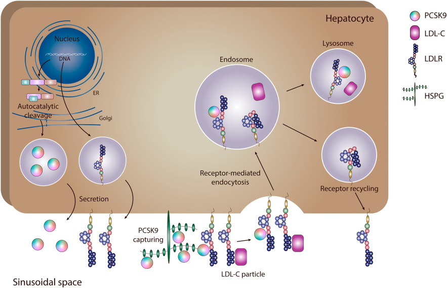 在哺乳动物的肝脏细胞中会高表达PCSK9和低密度脂蛋白受体(LDLR),PCSK9由肝脏细胞分泌后进入血液循环系统,而LDLR则表达在肝脏细胞膜上。LDLR的主要功能是负责结合血浆低密度脂蛋白胆固醇(LDL-C),并通过受体介导的内吞作用促进LDL-C的摄取,而进入细胞内的LDL-C和LDL-R复合物则会在胞内体中完成分离,随后LDL-R发生构象改变,并通过受体回收途径返回细胞膜。PCSK9在正常生理状态下可与LDLR结合,形成PCSK9-LDLR复合物。随后,该复合物被细胞内吞进入细胞,在溶酶体中被降解,导致肝细胞表面LDLR数量减少,使得肝细胞对 LDL-C 的摄取能力下降,进而导致血液中LDL-C水平升高。这一过程在维持体内胆固醇代谢平衡中发挥着重要的调节作用,但当PCSK9功能异常时,会导致 LDL-C水平过度升高。